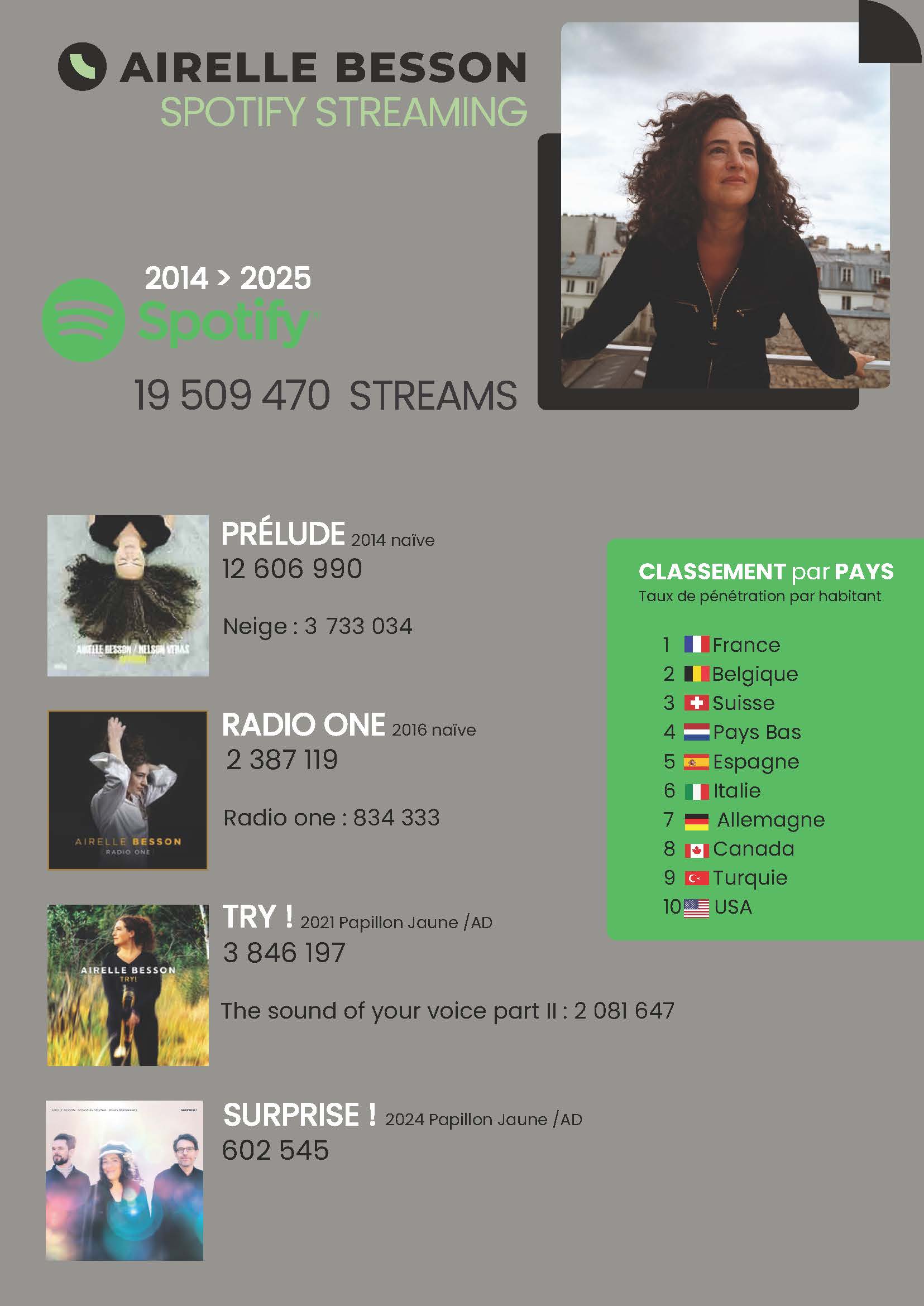 En 2014, Airelle Besson crée son propre quartet avec Isabel Sörling (voix), Benjamin Moussay (claviers) et Fabrice Moreau (batterie). Très bien accueilli tant par la presse que par le public, leur premier album (Radio One, Naïve) est un régal de force, d’équilibre et de limpidité. Toute la puissance mélodique des compositions d’Airelle Besson, ainsi que son talent pour harmoniser les voix, s’y déploient avec élégance. Leur deuxième album, TRY!, sortira le 5 février 2021. Parallèlement, Airelle Besson se consacre de plus en plus à la composition et à l’arrangement. En 2014, le groupe anglais Metronomy lui demande de faire les arrangements de l’album « Love Letters ». En 2020/21, elle est en résidence à la Cité musicale-Metz : elle créera avec l’Orchestre National de Metz un nouveau programme entre classique et jazz. Et sera avec le Big Band de l’Union de Woippy le temps d’une création.