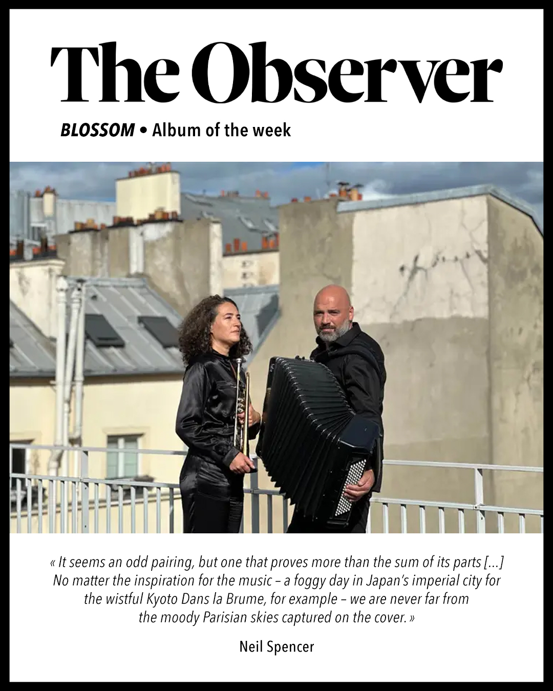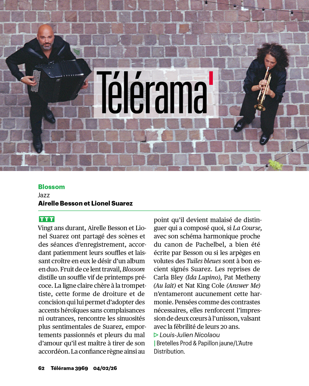 Ils se sont partagé le répertoire, peaufiné au fil des ans, et ont tenu à ouvrir l’album par le premier morceau qu’ils aient joué ensemble, Blossom, une brise printanière, une floraison spontanée. Également composés par Airelle, Kyoto dans la brume, fruit d’un séjour de la trompettiste dans la ville impériale, une ode à la douceur de vivre. Et La Course, issu de la partition musicale de trois courts-métrages burlesques de Fatty Arbuckle avec Buster Keaton, ciné-concert toujours en tournée. De son côté, Lionel Suarez avait composé Sans laisser d’adresse pour la pièce de théâtre Ici Nougaro, avec Grégory Montel et Le jour J à l’heure H pour un film de Jean-Henri Meunier. Les Tuiles bleues est un clin d’œil à son ami disparu Régis Gizavo, l’accordéoniste et chanteur malgache. Et trois pièces sont nées en studio, en fin de séance. Deux impromptus qu’ils ont cosignés, Lontano et Résonances, comme tombés du ciel. Et De passage, un solo de trompette qui servira d’intro, puisqu’il finit miraculeusement sur la première note des Tuiles Bleues…