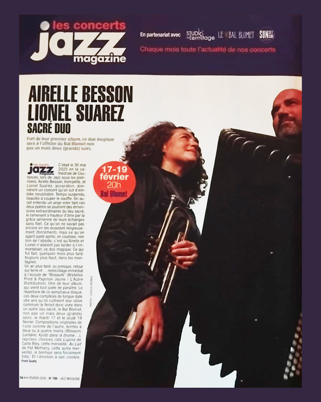 | 17 févr. | Airelle Besson / Jazz Magazine - Jazz et Compagnie | {20:00-00:00} Paris (75) Jazz Magazine - Jazz et Compagnie |