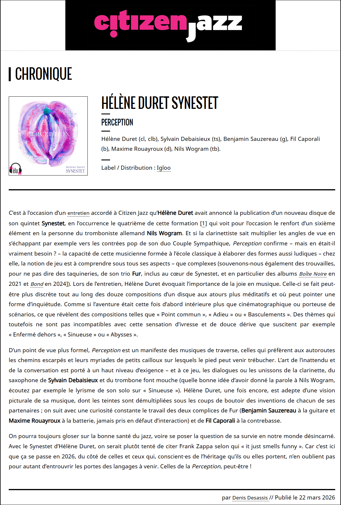 Initié par la clarinettiste et compositrice française Hélène Duret, Synestet est, à l’origine, un quintet franco-belge né à Bruxelles en 2018, qui signe trois albums sur le label Igloo records.Grâce à la participation de BOZAR Bruxelles, du festival Jazz sous les pommiers à Coutances, du label Igloo records et de la compagnie La Nageuse, le quintet devient un sextet résolument européen avec l’ajout de Nils Wogram au trombone qui rejoint l’équipe en special guest. Le 4ème album de Synestet, intitulé « Perception » sort le 24 avril 2026.
